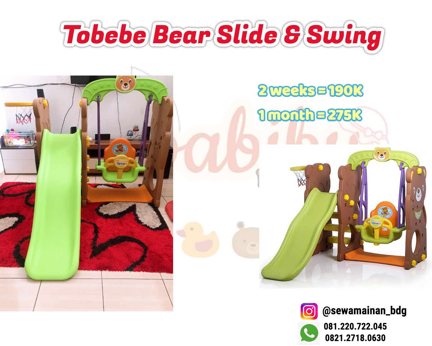 Disewakan Tobebe bear & slide. Perosotan yang dilengkapi ayunan & ring basket. Cocok untuk anak usia 1 tahun keatas agar betah di rumah moms..